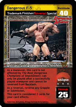As a maneuver, this card is not affected by The Most Dangerous Champions of SmackDown!; can only be played after a successfully played maneuver and cannot be reversed from Backlash. As a reversal, reverse any Grapple or Submission. This card is considered 2 cards for your card effects.