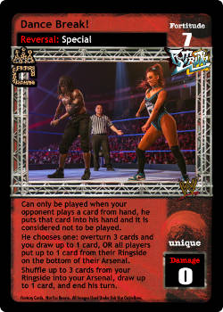Can only be played when your opponent plays a card from hand, he puts that card into his hand and it is considered not to be played. He chooses one: overturn 3 cards and you draw up to 1 card, OR all players put up to 1 card from their Ringside on the bottom of their Arsenal. Shuffle up to 3 cards from your Ringside into your Arsenal, draw up to 1 card, and end his turn.