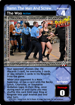 Your opponent chooses one: He discards 2 cards, he overturns 2 cards, or you remove 2 cards in his Ringside from the game. When your opponent is a Male Superstar, or has a card with the Becky Lynch, Charlotte, or Stephanie McMahon logos in their Ring, once during each of your turns you may shuffle this card from your Ring or Ringside into your Arsenal and end your turn.