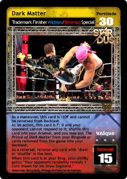 As a maneuver, this card is -10F and cannot be reversed from Backlash. As an action, this card is F: 0 and your opponent cannot respond to it; shuffle this card into your Arsenal, and you may put The Prince of Dark Matter from your Ringside or cards removed from the game into your Backlash. As a reversal, reverse any card with µdraw or µshuffle in the text. When this card is in your Ring, your Ability gains: 'Your opponent randomly reveals 1 card drawn for his Draw Segment.'