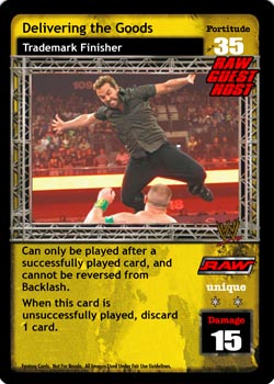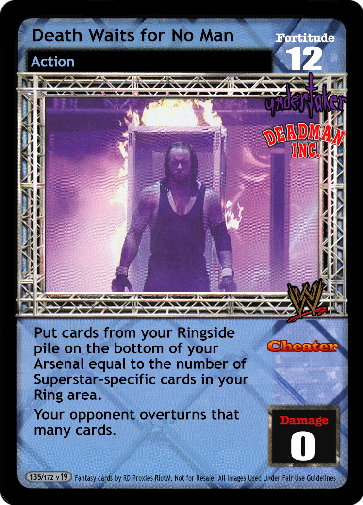 Put cards from your Ringside pile on the bottom of your Arsenal equal to the number of Superstar-specific cards in your Ring area. Your opponent overturns that many cards.