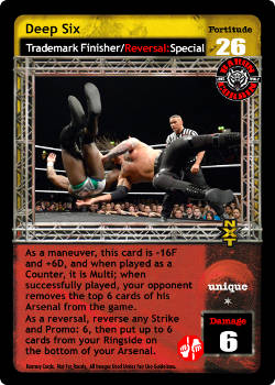 As a maneuver, this card is -16F and +6D, and when played as a Counter, it is Multi; when successfully played, your opponent removes the top 6 cards of his Arsenal from the game. As a reversal, reverse any Strike and Promo: 6, then put up to 6 cards from your Ringside on the bottom of your Arsenal.