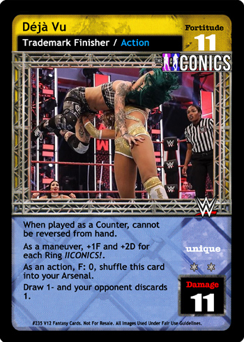 When played as a Counter, cannot be reversed from hand. As a maneuver, +1F and +2D for each Ring IICONICS!. As an action, F:0, shuffle this card into your Arsenal. Draw 1- and your opponent discards 1.