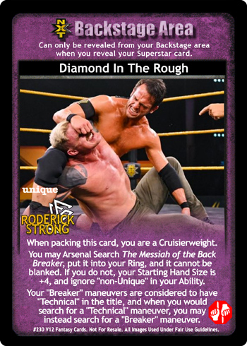 When packing this card, you are a Cruiserweight. You may Arsenal Search The Messiah of the Back Breaker, put it into your Ring, and it cannot be blanked. If you do not, your Starting Hand Size is +4, and ignore 'non-Unique' in your Ability. Your 'Breaker' maneuvers are considered to have 'Technical' in the title, and when you would search for a 'Technical' maneuver, you may instead search for a 'Breaker' maneuver.