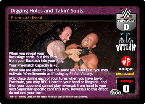 When you reveal your Backstage cards, put this card from your Backlash into your Ring. Your Pre-match Capacity is +3.When you are about to lose the game via Count Out, you may Activate Wrestlemania as if losing by Pinfall Victory.ACE: Once during each of your turns when you have lower Fortitude, you may RFG 1 card in your hand or Ringside, and then your opponent cannot play reversals from hand to your next Superstar-specific card this turn. Reversals to this effect do not end your turn.