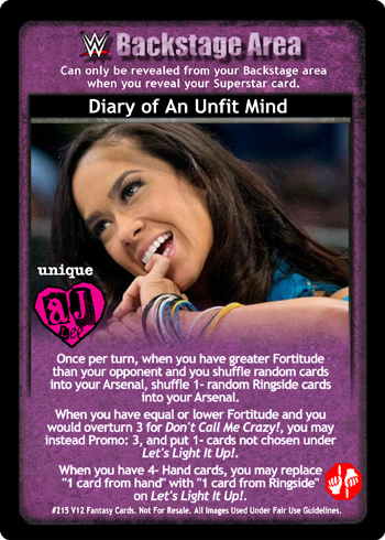 Once per turn, when you have greater Fortitude than your opponent and you shuffle random cards into your Arsenal, shuffle 1- random Ringside cards into your Arsenal. When you have equal or lower Fortitude and you would overturn 3 for Don't Call Me Crazy!, you may instead Promo: 3, and put 1- cards not chosen under Let's Light It Up!. When you have 4- Hand cards, you may replace '1 card from hand' with '1 card from Ringside' on Let's Light It Up!.