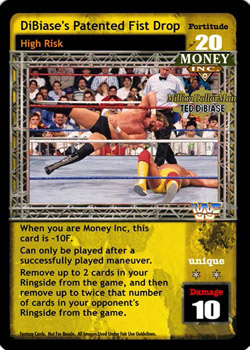When you are Money Inc, this card is -10F. Can only be played after a successfully played maneuver. Remove up to 2 cards in your Ringside from the game, and then remove up to twice that number of cards in your opponent's Ringside from the game.