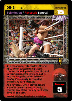 As a maneuver, this card is -5F and +5D; choose 1 non-Superstar-specific card in your opponent's Ring and put it into his Ringside; when Emma's Bubbly Personality is revealed, choose any card instead. As a reversal, when played ignore any of his reversal restrictions; reverse any Strike, or any card with 'diva' in the text.
