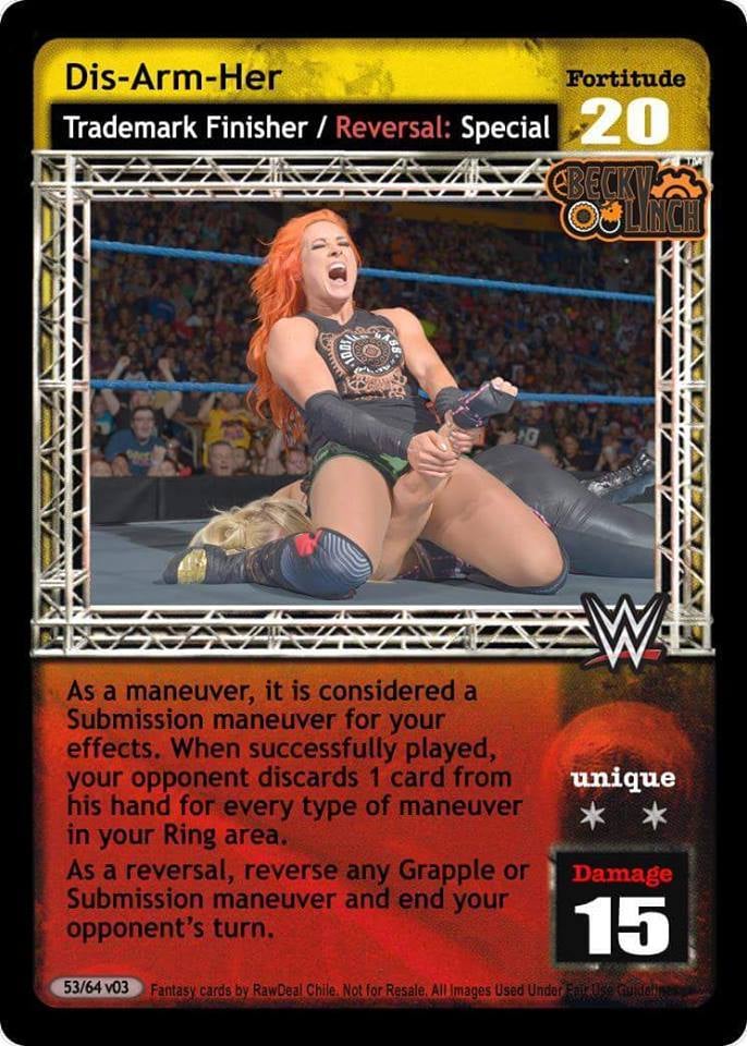 As a maneuver, it is considered a Submission maneuver for your effects. When successfully played, your opponent discards 1 card from his hand for every type of maneuver in your Ring area. As a reversal, reverse any Grapple or Submission maneuver and end your opponent's turn.