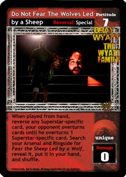 When played from hand, reverse any Superstar-specific card, your opponent overturns cards until he overturns 1 Superstar-specific card. Search your Arsenal and Ringside for Fear the Sheep Led by a Wolf, reveal it, put it in your hand, and shuffle.