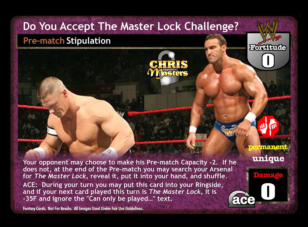 Your opponent may choose to make his Pre-match Capacity -2. If he does not, at the end of the Pre-match you may search your Arsenal for The Master Lock, reveal it, put it into your hand, and shuffle your Arsenal. ACE: During your turn you may put this card into your Ringside, and if your next card played this turn is The Master Lock, it is -35F and you may ignore the 'Can only be played...' text.