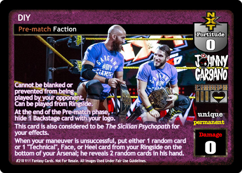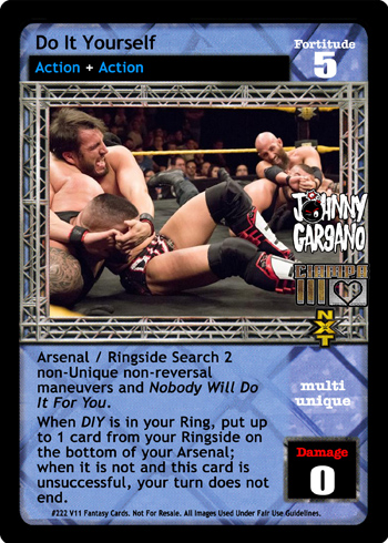 Arsenal / Ringside Search 2 non-Unique non-reversal maneuvers and Nobody Will Do It For You. When DIY is in your Ring, put up to 1 card from your Ringside on the bottom of your Arsenal; when it is not and this card is unsuccessful, your turn does not end.