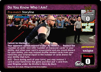 Cannot be blanked. Your opponent cannot respond to your My Name Is... Replace the 'number of cards' text with 'number of maneuver cards' in your Ability, and when your card is unsuccessful and you would discard for your Ability, you may instead shuffle random cards from your hand into your Arsenal equal to the number of cards drawn for your Ability that turn. ACE: Once during each of your turns, you may remove 1 card in your hand from the game and then put 1 card from your Ringside under My Brothers Have My Back.