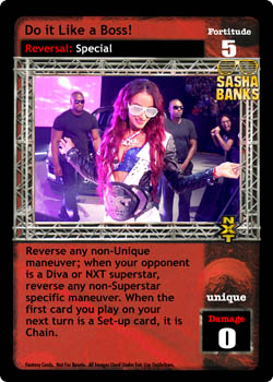 Reverse any non-Unique maneuver; when your opponent is a Diva or NXT superstar, reverse any non-Superstar-specific maneuver. When the first card you play on your next turn is a Set-up card, it is Chain.