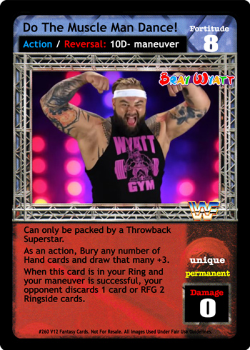 Can only be packed by a Throwback Superstar. As an action, Bury any number of Hand cards and draw that many +3. As a reversal, reverse any 10D- maneuver. When this card is in your Ring and your maneuver is successful, your opponent discards 1 card or RFG 2 Ringside cards.