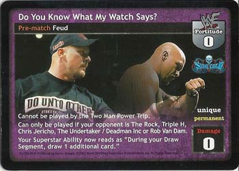 Cannot be played by the Two Man Power Trip. Can only be played if your opponent is The Rock, Triple H, Chris Jericho, The Undertaker / Deadman Inc, or Rob Van Dam. Your Superstar Ability now reads as "During your Draw Segment, draw 1 additional card."