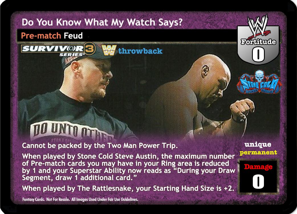 Cannot be packed by the Two Man Power Trip. When played by Stone Cold Steve Austin, the maximum number of Pre-match cards you may have in your Ring area is reduced by 1 and your Superstar Ability now reads as "During your Draw Segment, draw 1 additional card." When played by The Rattlesnake, your Starting Hand Size is +2.