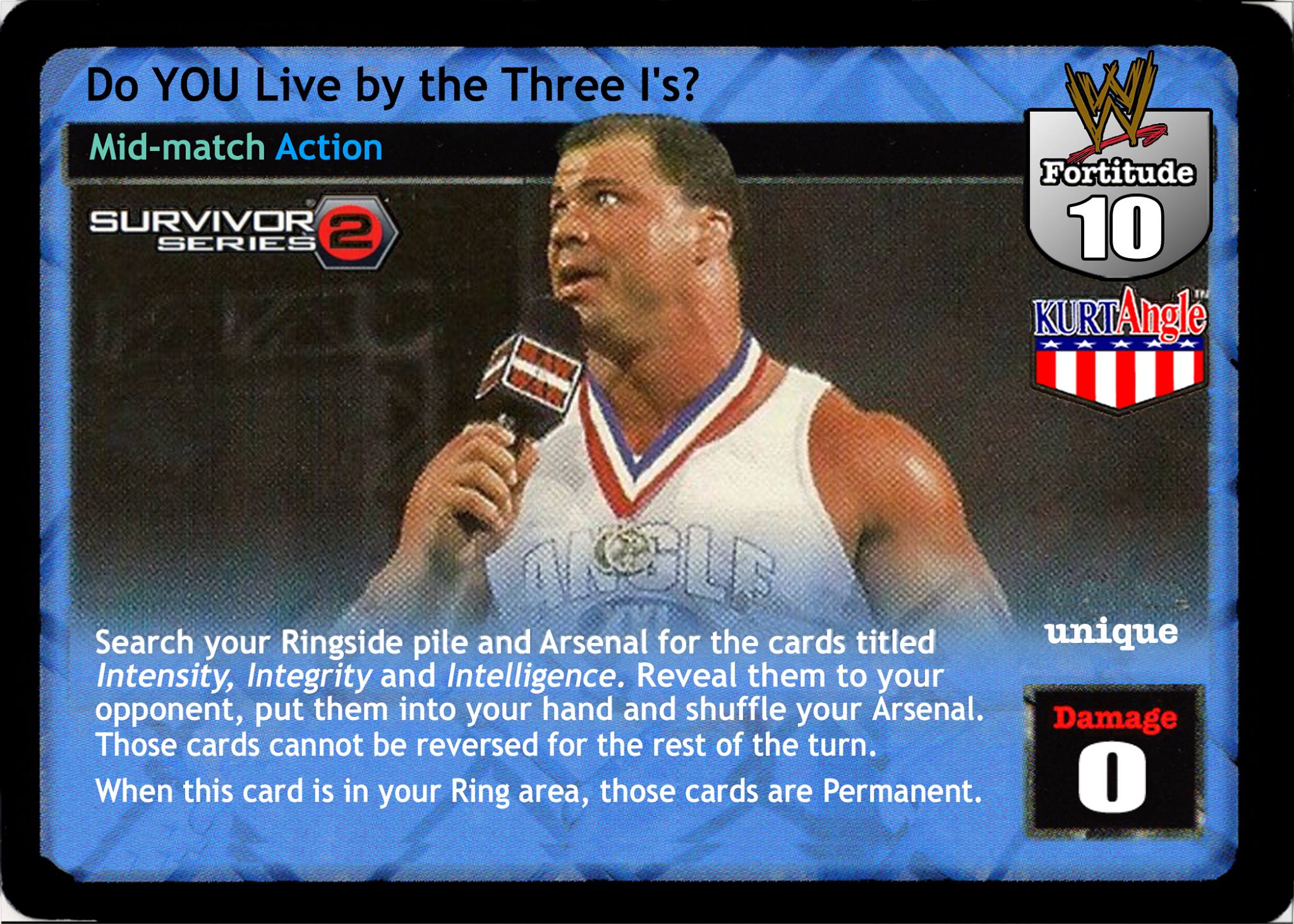 Search your Ringside pile and Arsenal for the cards titled Intensity, Integrity, and Intelligence, reveal them to your opponent, put them into your hand, and shuffle your Arsenal. Those cards cannot be reversed for the rest of the turn. When this card is in your Ring area, those cards are Permanent.