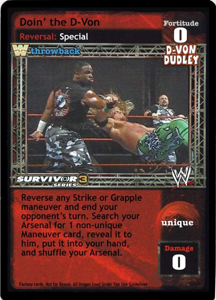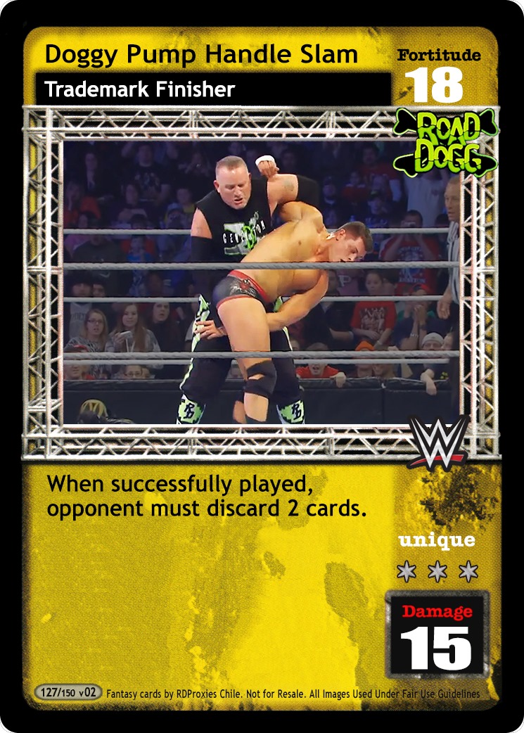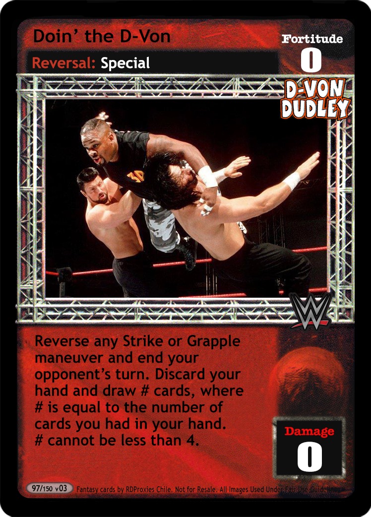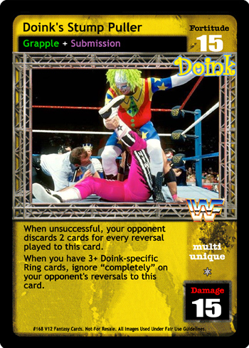 When unsuccessful, your opponent discards 2 cards for every reversal played to this card. When you have 3+ Doink-specific Ring cards, ignore 'completely' on your opponent's reversals to this card.