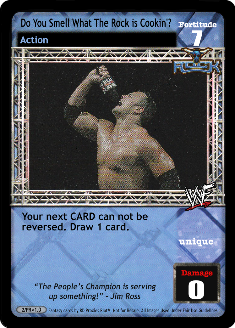Cannot be packed by the Two Man Power Trip. The card titled Hell in the Cell Match is blanked for the rest of the turn. When your Fortitude Rating is less than your opponent's Fortitude Rating and you have fewer cards in your hand than him, he discards # cards, where # is equal to the number of cards he has in his hand greater than you. When played by The Rattlesnake, you may then draw up to 2 cards. When your Fortitude Rating is greater than your opponent's Fortitude Rating, he discards his hand. Choose # cards from his Ringside pile and put them into his hand, where # is equal to the number of cards discarded. When played by The Rattlesnake, he then discards 2 cards.