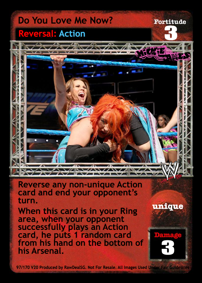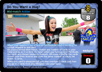 When your opponent has a Face or Fan Favorite card in his Ring, he cannot respond to this card. All players reveal their hands, choose any number of cards in your hand and up to 3 cards in his hand (when you have greater Fortitude, the cards are chosen randomly instead). All players shuffle the cards chosen into their Arsenal and draw the same number of cards; he draws -2 cards. When this card is unsuccessful, you may overturn 3 cards and then put up to 2 cards from your Ringside into your hand.