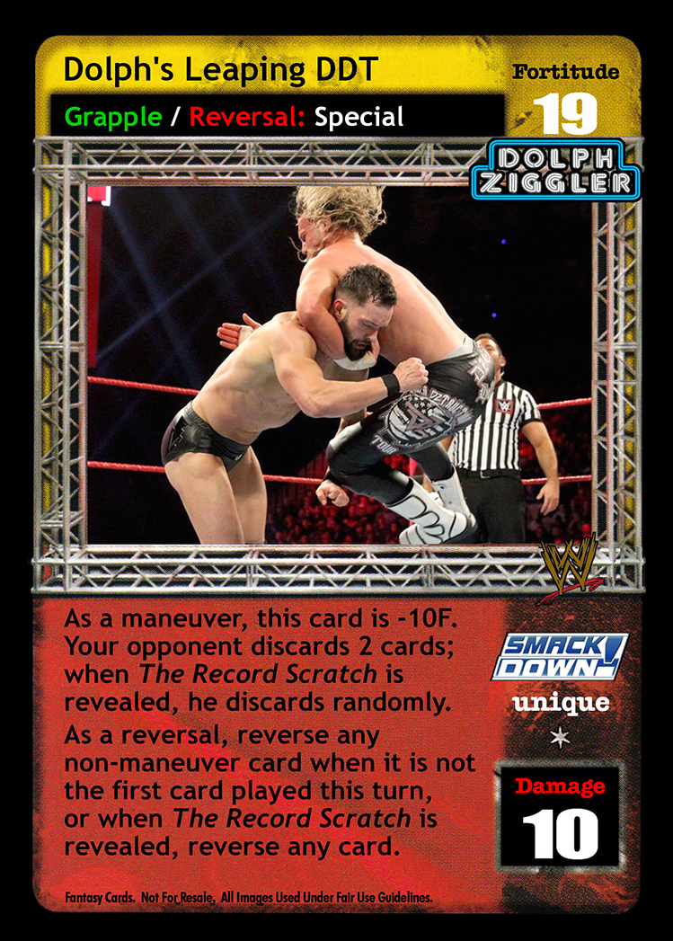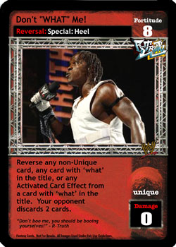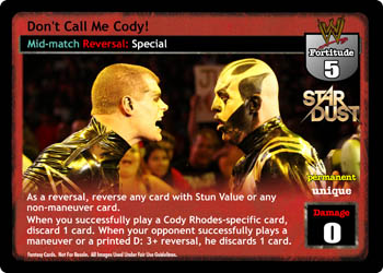 As a reversal, reverse any card with Stun Value or any non-maneuver card. When you successfully play a Cody Rhodes-specific card, discard 1 card. When your opponent successfully plays a maneuver or a printed D: 3+ reversal, he discards 1 card.