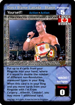 Put up to # cards from your Ringside into your hand, where # is equal to double the number of different non-Revolution maneuver types in your Ring. When this card is in your Ring and you move cards from your Ringside with I'm From Calgary... Alberta, Canada!, you may move 1 additional card.