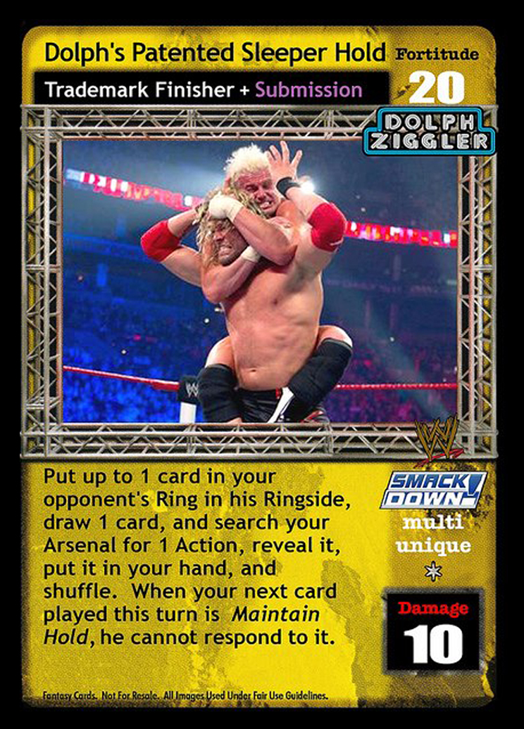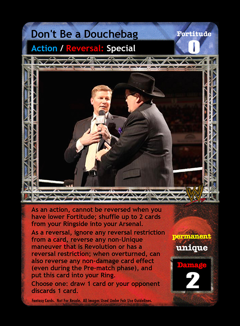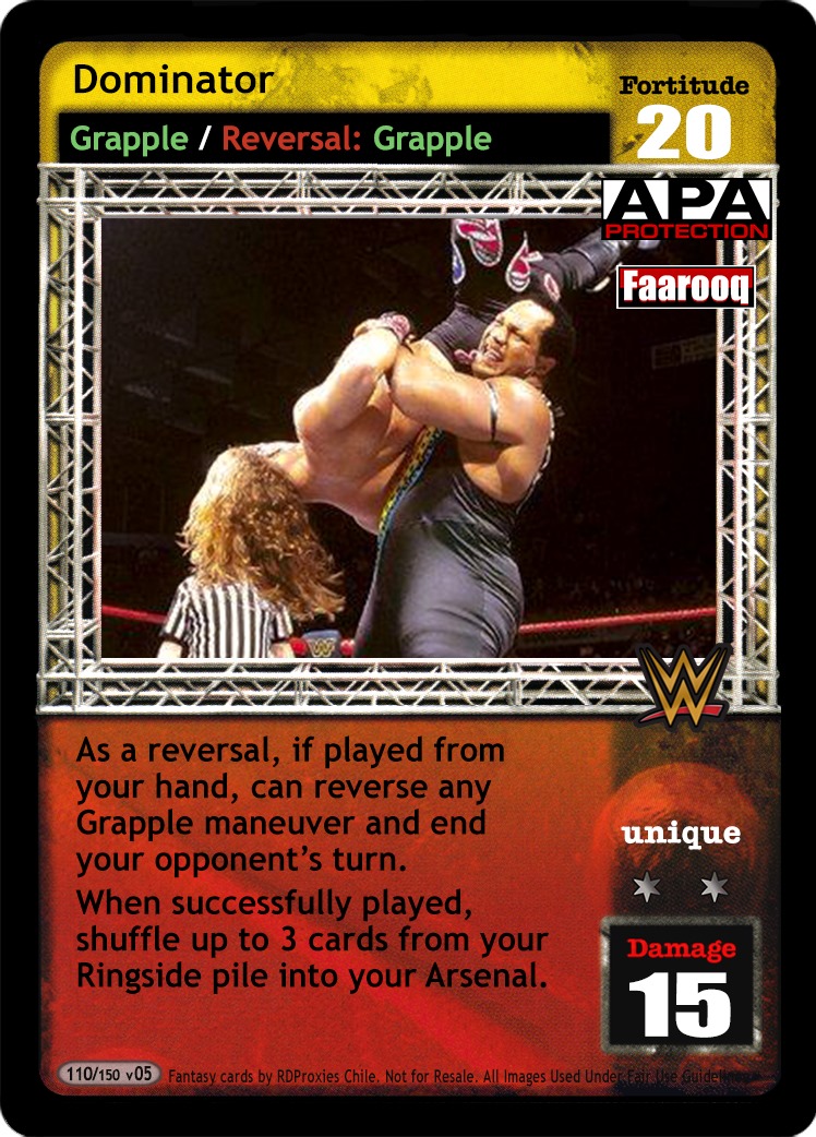 As a reversal, if played from your hand can reverse any Grapple maneuver and end your opponent's turn. When successfully played, shuffle up to 3 cards from your Ringside pile into your Arsenal.