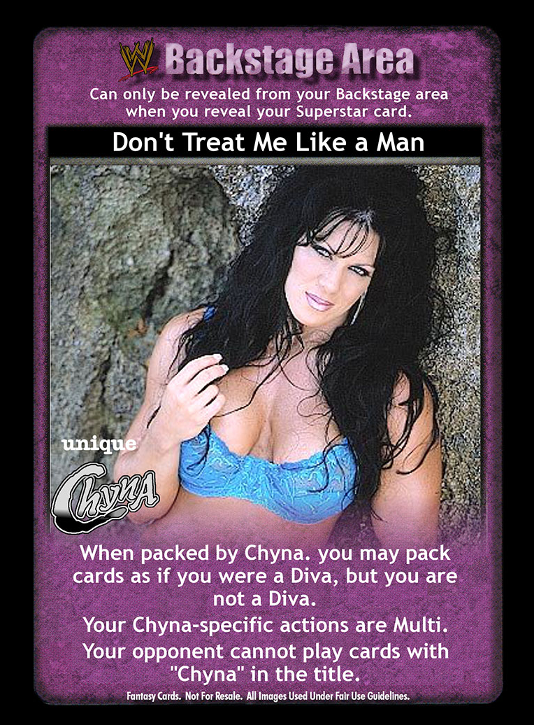 When packed by Chyna, you may pack cards as if you were a Diva, but you are not a Diva. Your Chyna-specific actions are Multi. Your opponent cannot play cards with 'Chyna' in the title.