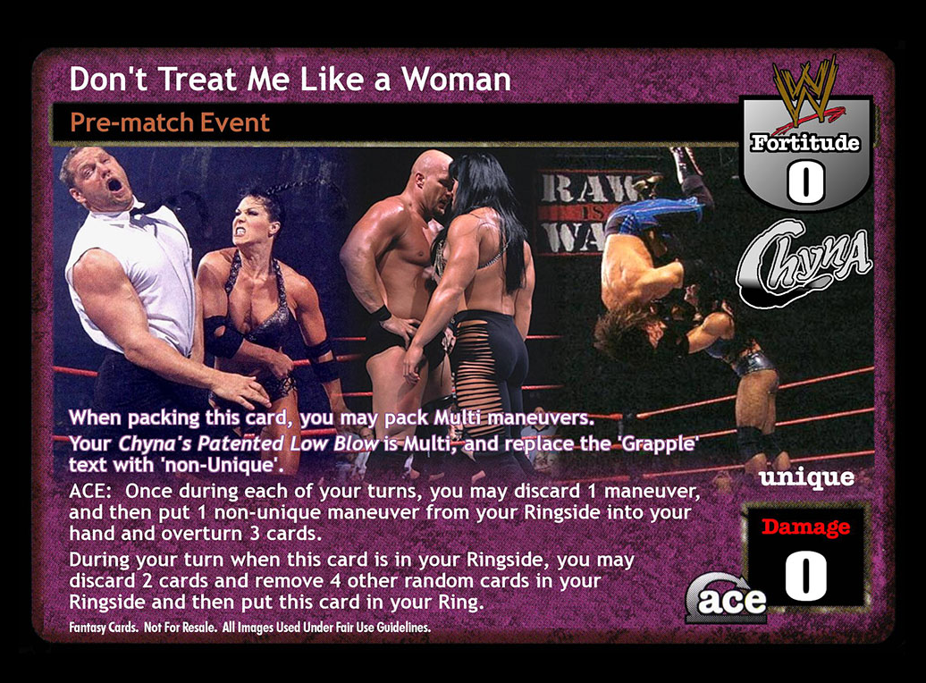 When packing this card, you may pack Multi maneuvers. Your Chyna's Patented Low Blow is Multi, and replace the 'Grapple' text with 'non-Unique'. ACE: Once during each of your turns, you may discard 1 maneuver and then put 1 non-unique maneuver from your Ringside into your hand and overturn 3 cards. During your turn when this card is in your Ringside, you may discard 2 cards and remove 4 other random cards in your Ringside and then put this card in your Ring.