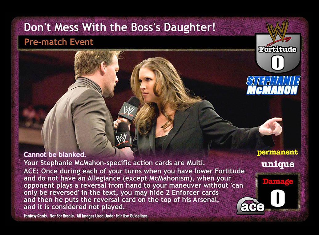 Cannot be blanked. Your Stephanie McMahon-specific action cards are Multi. ACE: Once during each of your turns when you have lower Fortitude and do not have an Allegiance (except McMahonism), when your opponent plays a reversal from hand to your maneuver without 'can only be reversed' in the text, you may hide 2 Enforcer cards and then he puts that reversal on top of his Arsenal and it is considered not played.
