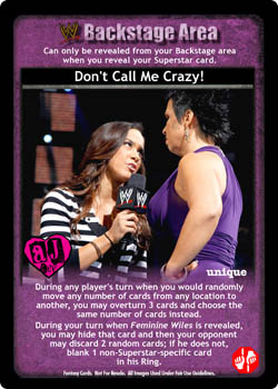 During any player's turn when you would randomly move any number of cards from any location to another, you may overturn 3 cards and choose the same number of cards instead. During your turn when Feminine Wiles is revealed, you may hide that card and then your opponent may discard 2 random cards; if he does not, blank 1 non-Superstar-specific card in his Ring.