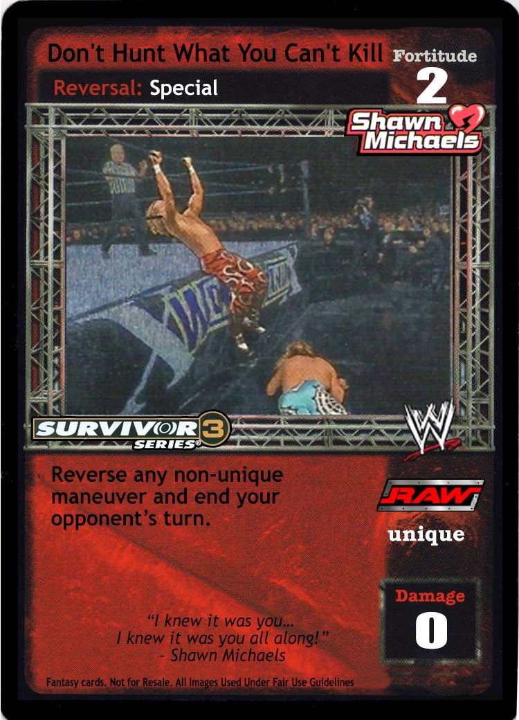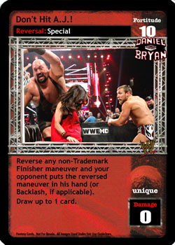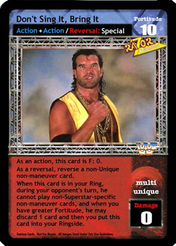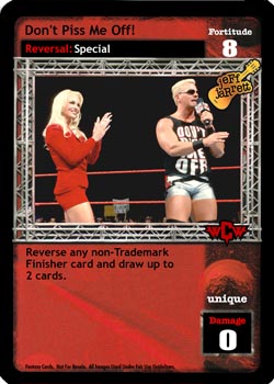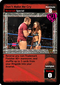 As an action, this card is F: 0. As a reversal, reverse a non-Unique non-maneuver card. Your opponent cannot play non-Superstar-specific non-maneuver cards. When you have greater Fortitude, he may discard 1 card and then you put this card into your Ringside.