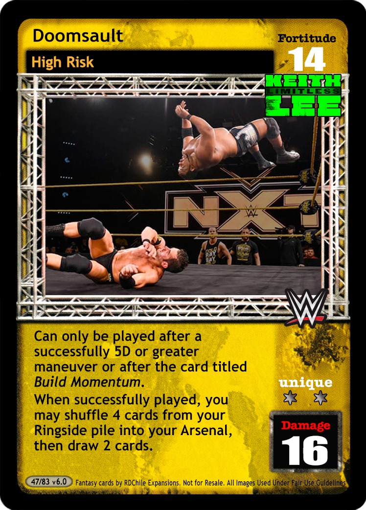Can only de played after a successfully 5D or greater maneuver or after the card title “Build Momentum” When successfully played, you may shuffle 4 cards form your ringside pile into your arsenal, then draw 2 cards.