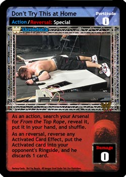 As an action, search your Arsenal for From the Top Rope, reveal it, put it into your hand, and shuffle. As a reversal, reverse any Activated Card Effect, put the Activated card into your opponent's Ringside, and he discards 1 card.