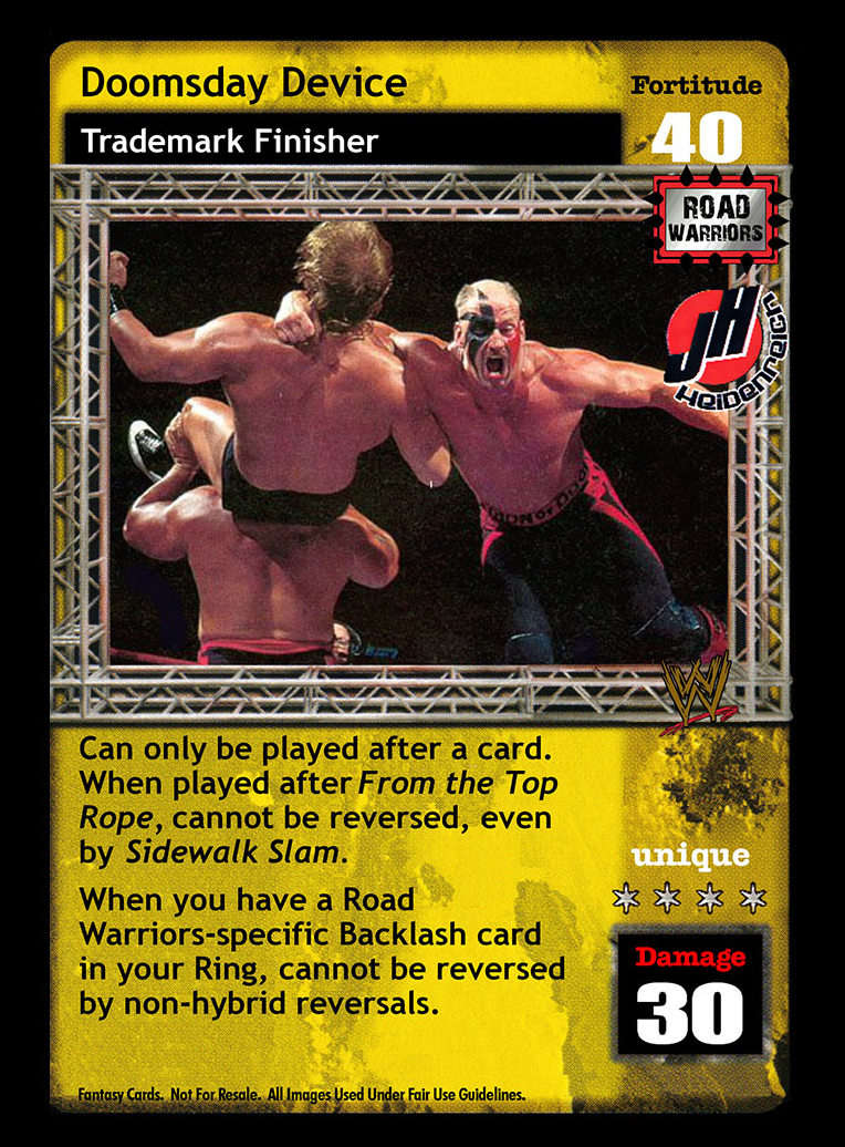 Can only be played after a card. When played after From the Top Rope, cannot be reversed, even by Sidewalk Slam. When you have a Road Warriors-specific Backlash card in your Ring, cannot be reversed by non-hybrid reversals.