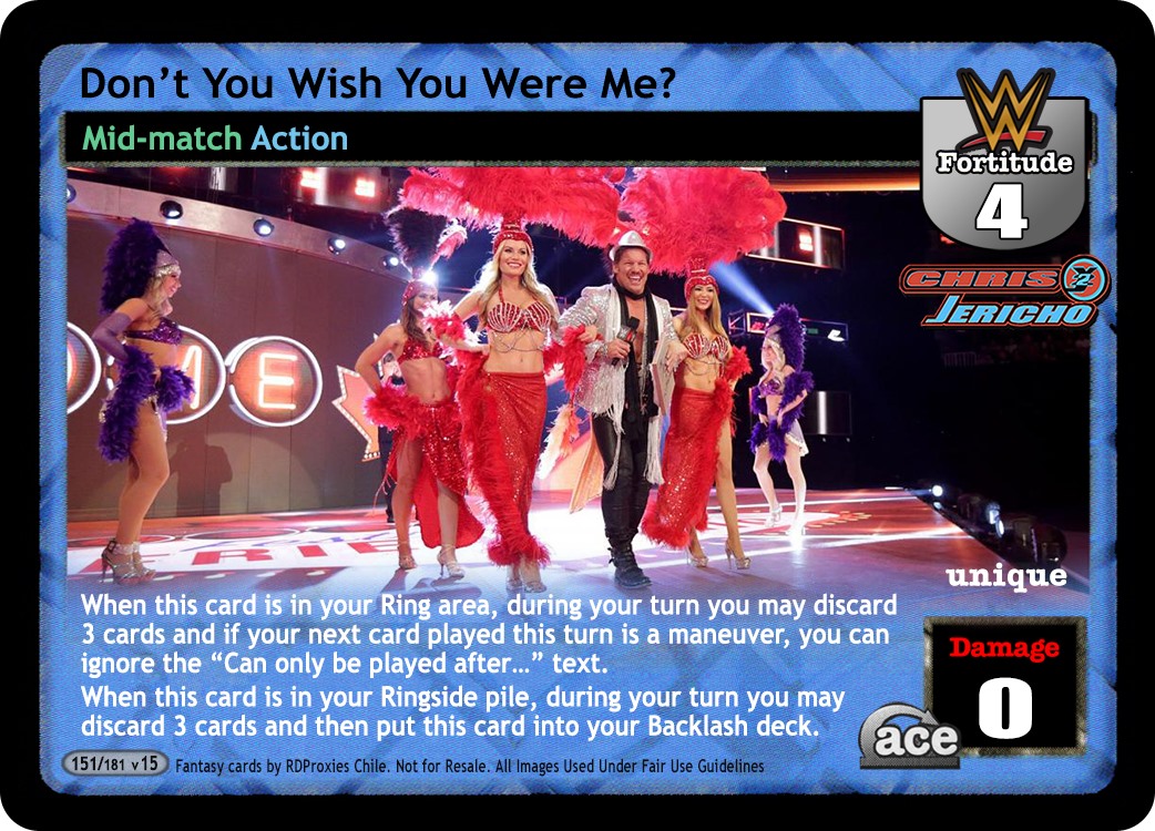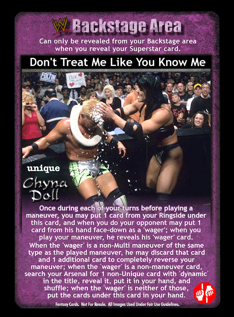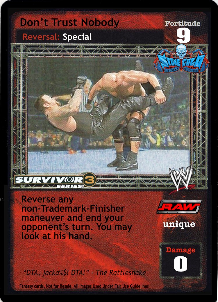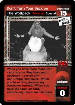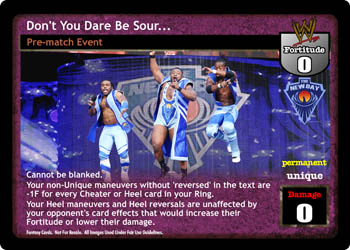 Cannot be blanked. Your non-Unique maneuvers without 'reversed' in the text are -1F for every Cheater or Heel card in your Ring. Your Heel maneuvers and Heel reversals are unaffected by your opponent's card effects that would increase their Fortitude or lower their damage.