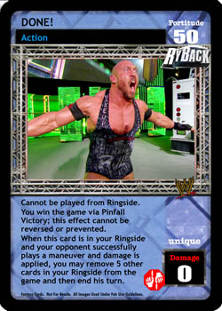 Cannot be played from Ringside. You win the game via Pinfall Victory; this effect cannot be reversed or prevented. When this card is in your Ringside and your opponent successfully plays a maneuver and damage is applied, you may remove 5 other cards in your Ringside from the game and then end his turn.