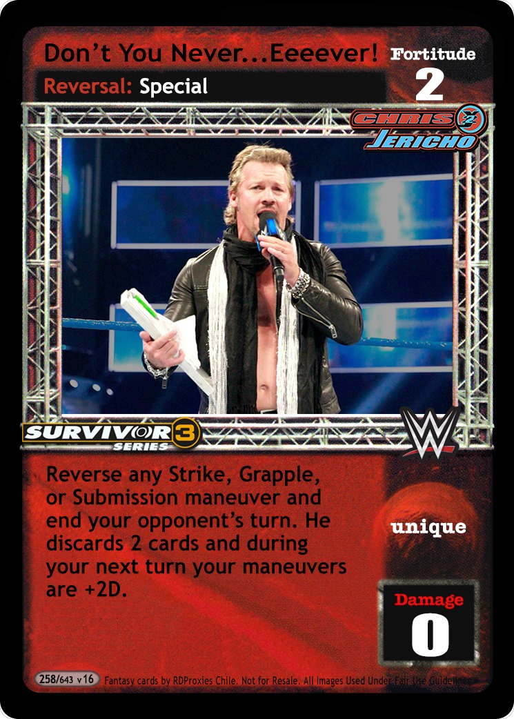 Reverse any Strike, Grapple, or Submission maneuver and end your opponent's turn. Your opponent discards 2 cards and on your next turn your maneuvers are +2D.