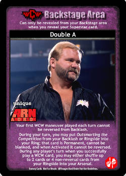 Your first WCW maneuver played each turn cannot be reversed from Backlash. During your turn, you may put Outsmarting the Competition from your Backlash or Ringside into your Ring; that card is Permanent, cannot be blanked, and when Activated, it cannot be reversed. During any player's turn when you successfully play a WCW card, you may either shuffle up to 2 cards or 4 non-reversal cards from your Ringside into your Arsenal.