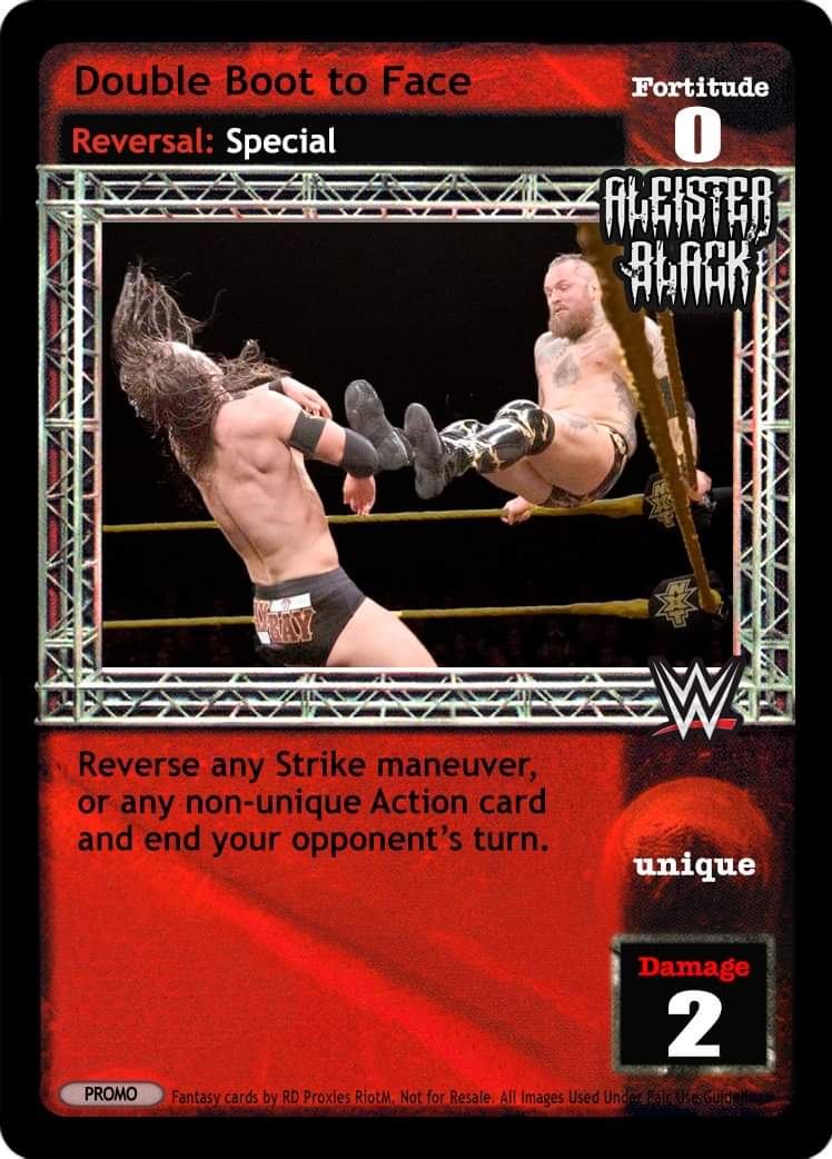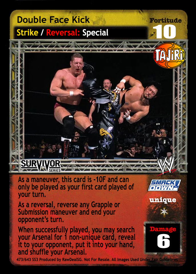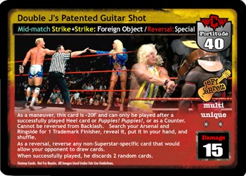 As a maneuver, this card is -20F and can only be played after a successfully played Heel card or Puppies! Puppies!, or as a Counter. Cannot be reversed from Backlash. Search your Arsenal and Ringside for 1 Trademark Finisher, reveal it, put it in your hand, and shuffle. As a reversal, reverse any non-Superstar-specific card that would allow your opponent to draw cards. When successfully played, he discards 2 random cards.
