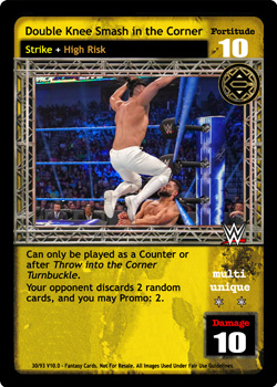 Can only be played as a Counter or after Throw into the Corner Turnbuckle. Your opponent discards 2 random cards, and you may Promo: 2.