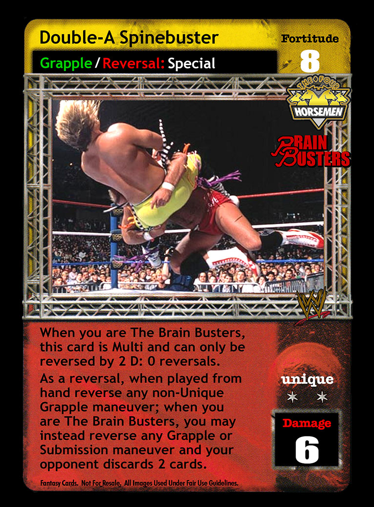 When you are The Brain Busters, this card is Multi and can only be reversed by 2 D: 0 reversals. As a reversal, when played from hand reverse any non-Unique Grapple maneuver. When you are The Brain Busters, you may instead reverse any Grapple or Submission maneuver and your opponent discards 2 cards.