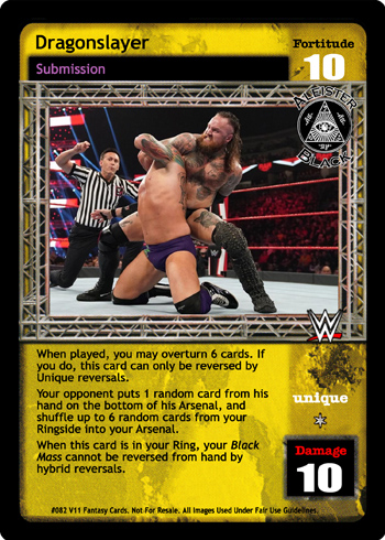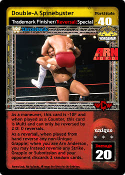 As a maneuver, this card is -10F and when played as a Counter, this card is Multi and can only be reversed by 2 D: 0 reversals. As a reversal, when played from hand reverse any non-Unique Grapple; when you are Arn Anderson, you may instead reverse any Strike, Grapple or Submission and your opponent discards 2 random cards.