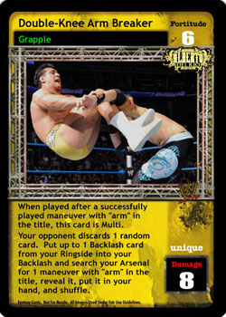When played after a successfully played maneuver with 'arm' in the title, this card is Multi. Your opponent discards 1 random card. Put up to 1 Backlash card from your Ringside into your Backlash and search your Arsenal for a maneuver with 'arm' in the title, reveal it, put it in your hand, and shuffle.