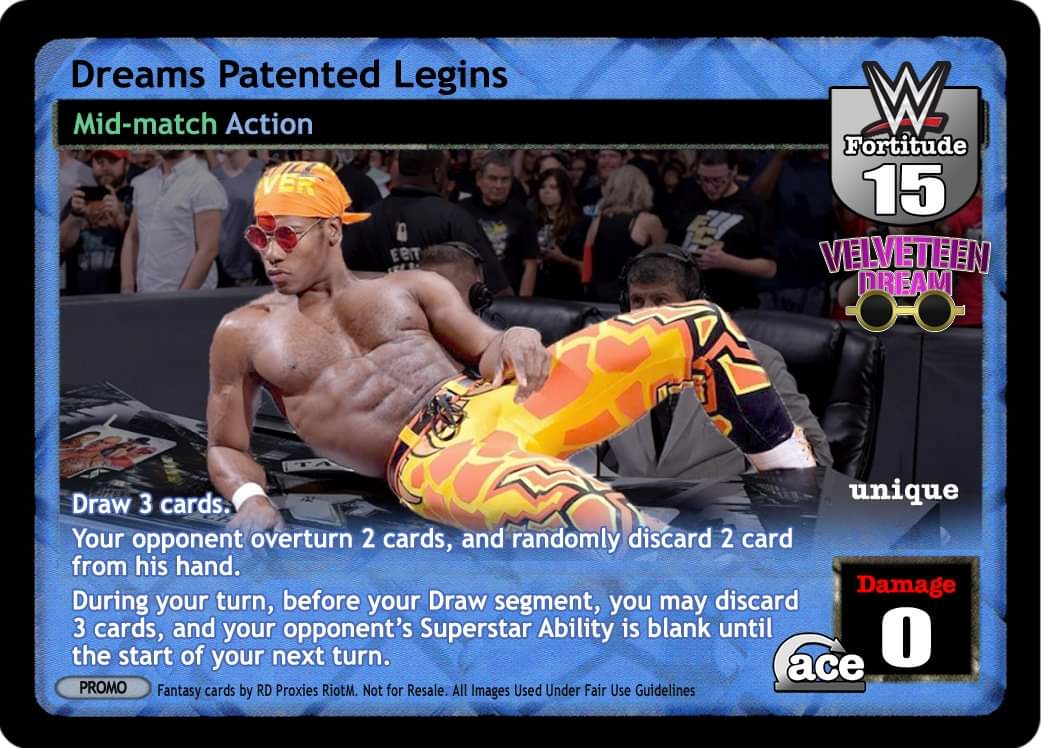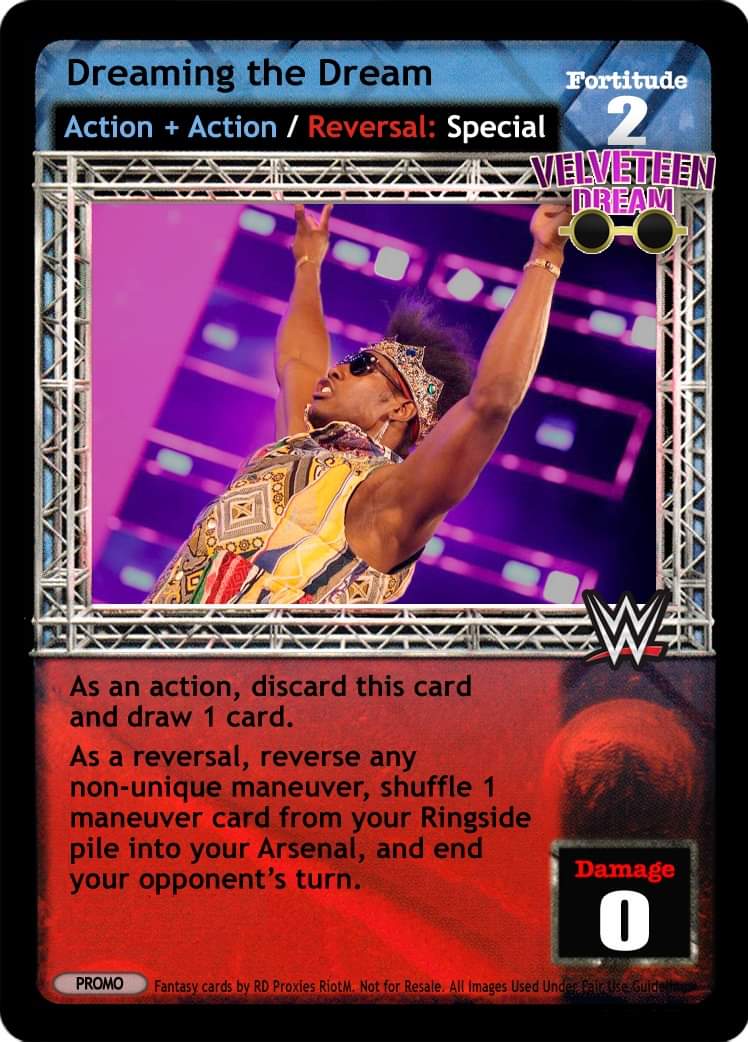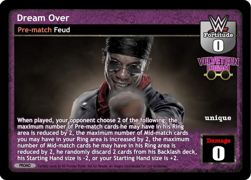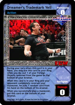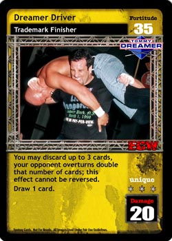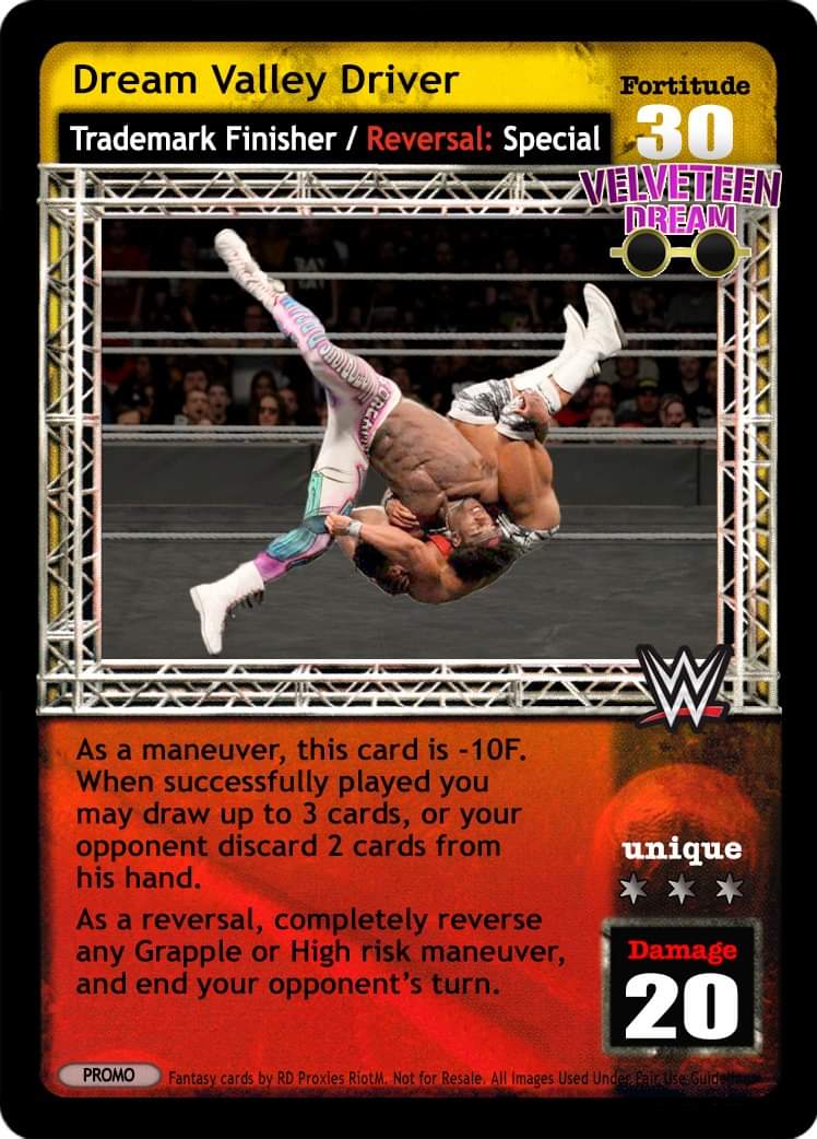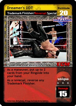 as a maneuver, this card is -10F. When successfully played, you may draw 3 cards, or your opponent discards 2 cards from his hand. as a reversal, completely reverse any grapple or high risk maneuver, and end your opponent's turn unique