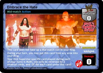 This card does not take up a Mid-match slot in your Ring. During your turn, you may put this card from any area into your Ring. Your first Superstar-specific card played during each of your turns is Multi, can only be reversed by 2 reversal cards, and -2F for each card under this card.