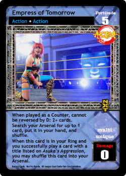 When played as a Counter, cannot be reversed by D: 2+ cards. Search your Arsenal for up to 1 card, put it in your hand, and shuffle. When this card is in your Ring and you successfully play a card with a title listed on Asuka's Aggression, you may shuffle this card into your Arsenal.