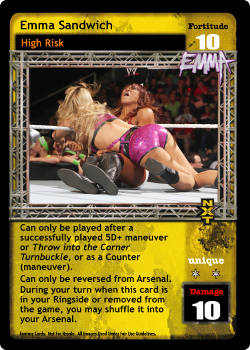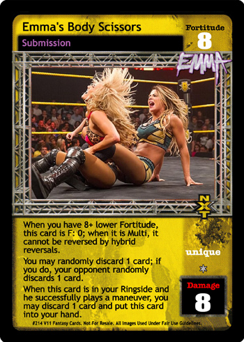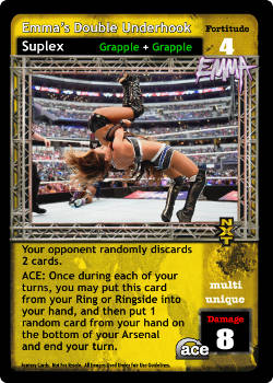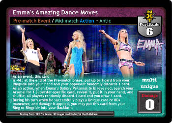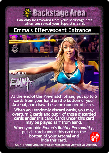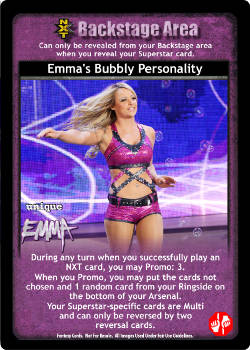 As an event, this card is -6F; at the end of the Pre-match phase, put up to 1 card from your Ringside into your hand and your opponent randomly discards 1 card. As an action, when Emma's Bubbly Personality is revealed, search your Arsenal for 1 Superstar-specific card, reveal it, put it in your hand, and shuffle; all players randomly discard 1 card and you draw 1 card. During his turn when he successfully plays a Unique card or 8D+ maneuver, and damage is applied, you may put this card from your Ring or Ringside into your Backlash.