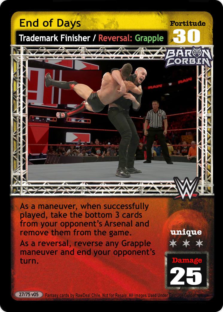 Can only be played after a successfully played 5D+ maneuver or Throw into the Corner Turnbuckle, or as a Counter (maneuver). Can only be reversed from Arsenal. During your turn when this card is in your Ringside or removed from the game, you may shuffle it into your Arsenal.